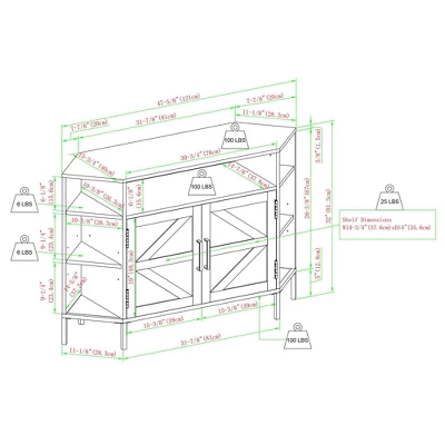• Weight capacities: Top surface, cubby, and bottom panel 100 lbs. each, center shelf 25 lbs., side shelves 6 lbs. each