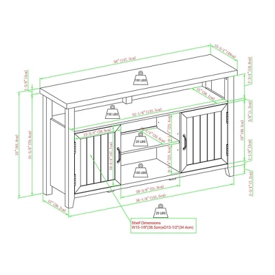 • Weight capacities: Top surface 150 lbs., upper shelf 150 lbs., center top and cabinet shelves, 25 lbs. Center bottom, 150 lbs.,