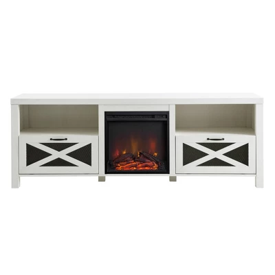 Rejuvenate your entertainment setup with Saracina Home’s Newark Industrial Farmhouse Drop Down Metal Mesh X Door 70″ TV Stand with Electric Fireplace. The easy-to-install electric fireplace insert ignites new warmth into your living room. Separate switches control the heat and the LED flames, so you can choose one or both to fit your mood. Two open shelves are the perfect place to display our media components, while the two drop-down doors keep your space looking organized. The doors’ X fronts and metal mesh panels provide the perfect rustic accompaniment to your cozy atmosphere.